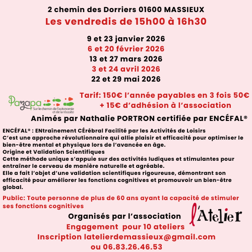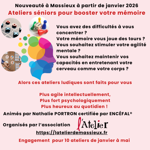 Rejoignez le programme 10 ateliers mémoires séniors organisé par l’association L’atelier de Massieux dès janvier 2026.